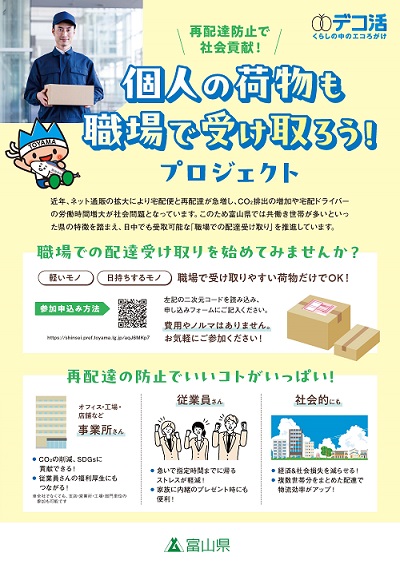 富山県では、二酸化排出量の増加などで社会的な課題になっている「宅配便の再配達」を削減するため、共働きが多い本件の特徴を踏まえ、日中でも受取り可能な職場での受取りを促進しております。