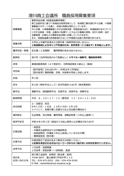 詳細は上記画像または コチラ から募集要項をご覧になるか、ハローワークインターネットサービス から「滑川商工会議所」を検索しご確認ください。
